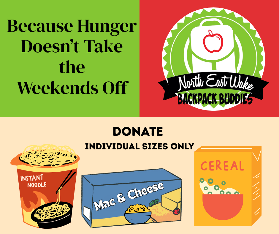 During packet pickup we are helping the North East Wake Backpack Buddies Student Board collect donations. To help provide food every weekend to children who are identified as ‘food insecure’ by teachers and guidance counselors at each school.