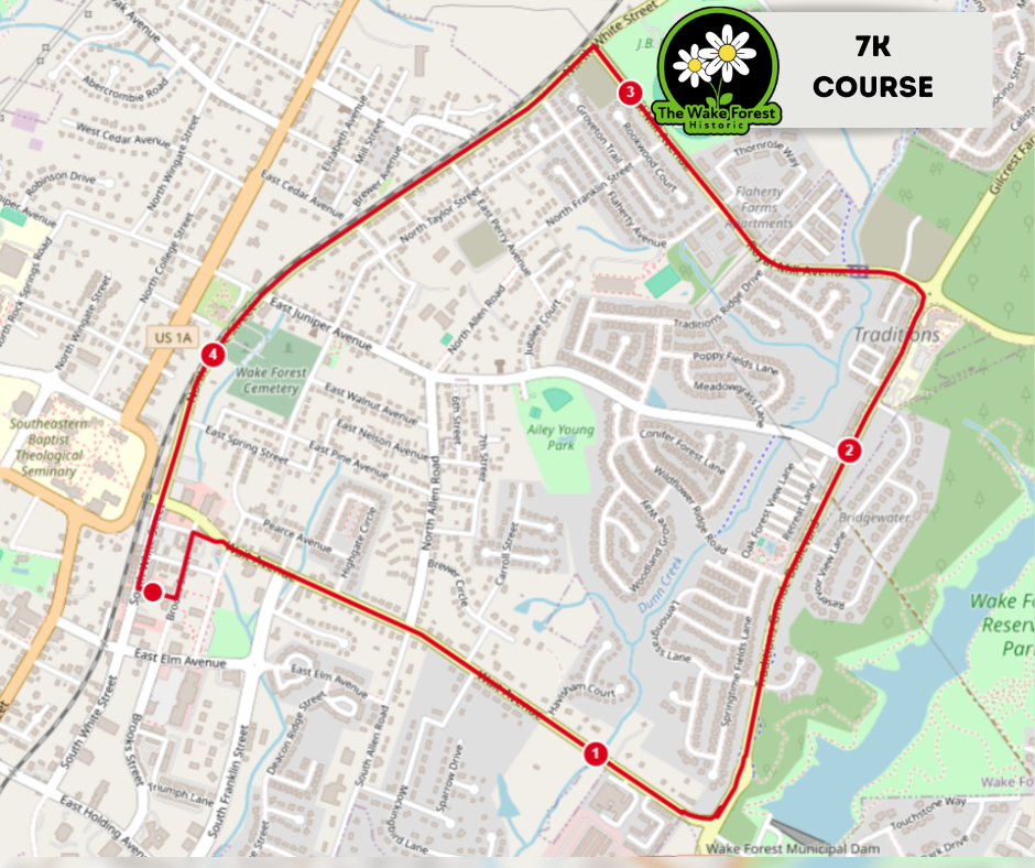 Roads will not be closed: This means you will be running with the flow of traffic at all times. Please watch for direction arrows and listen to volunteer directions.The start/finish line will be on E. Owens Ave located across the street from Wake Forest Town Hall. GPS: 301 Brooks Street, Wake Forest, NC 27587